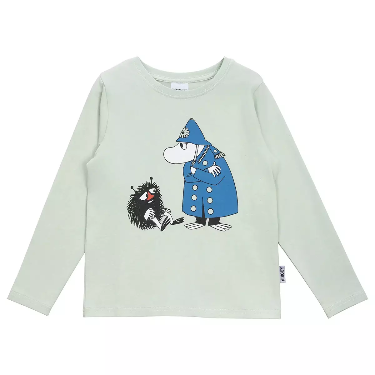 Martinex Poliisimestari Tröja i grönt, är gjord av mjuk ekologisk bomull, som känns behaglig mot barnets hud. I den ljusgröna tröjan förundras Poliisimestari över Haisulis påhitt.