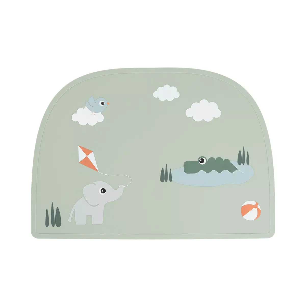 Söt ljusgrön matta i halvmåneform med dekoration av olika djurmotiv. Den kan även användas som ritar- och målarunderlag. Mattan är lätt att torka av och kan diskas i diskmaskin.