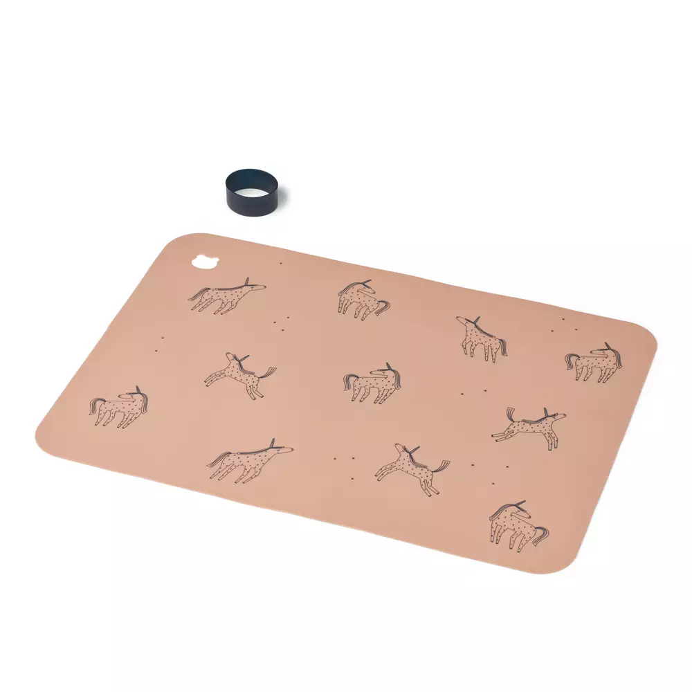 Matta i silikon Liewood Unicorn pale tuscany är 100% silikon. Matta skyddar bordet och är lätt att torka av med en fuktig trasa. I matta finns ett hål i hörnet för upphängning och förvaring. På mattan finns roliga bilder av enhörningar.