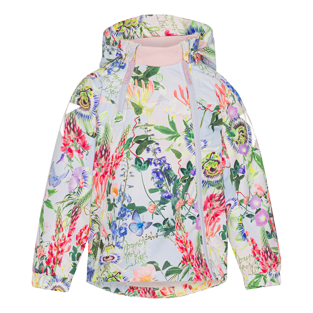 Molo Hopla vår- och höstjacka Big Passion är en vattentålig jacka för utomhusaktiviteter på våren och hösten. Alla sömmar på den vattentäta jackan är tejpade och den står emot vinden bra, vilket gör utomhusaktiviteter möjliga oavsett väder. Jackan har ett färgglatt blomtryck som harmonierar med många olika färger av accessoarer och byxor.