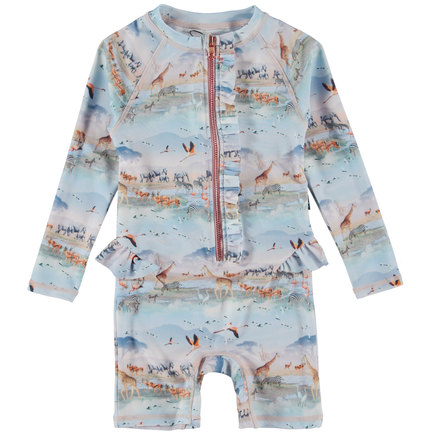 Molo Nigella baddräkt Savannah Mist 2023 skyddar effektivt barnet mot solen vid stranden, under sommarlekar i trädgården, i stugan och på solsemestern. Långa ärmar och korta ben samt midjesnörning som en söt detalj med volanger.