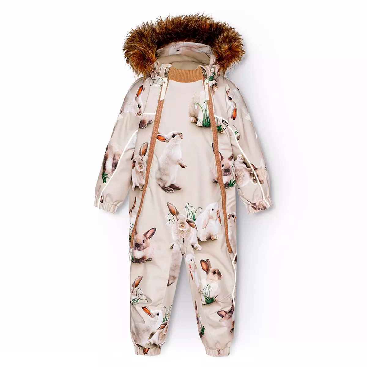 Molo vinteroverall Pyxis Fur Winter Rabbits är en favoritmodell för de minsta under de kalla vintermånaderna. Fur-modellen har en fluffig konstpälsdetalj vid huven.