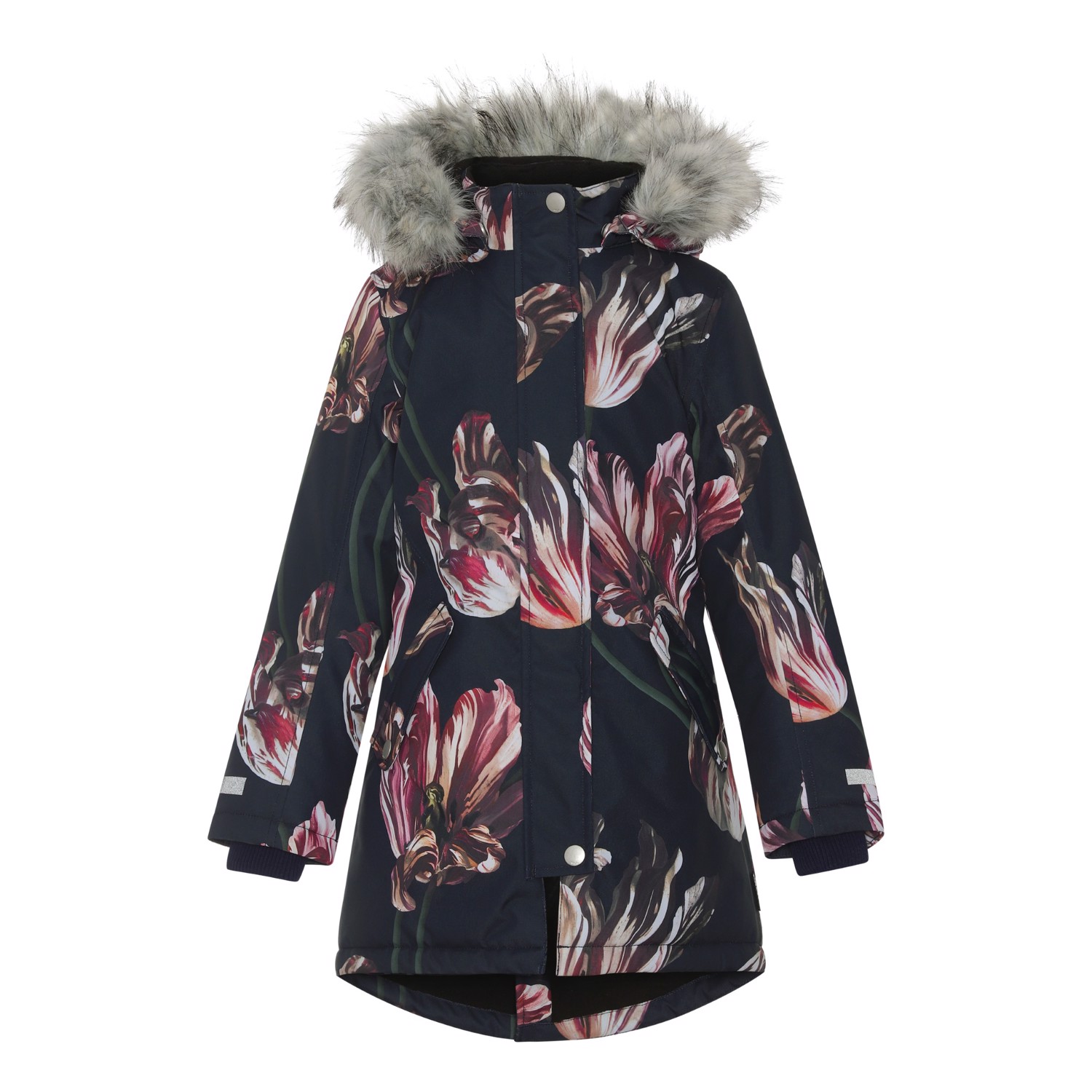 Molo vinterjacka Peace Tulips 2022 är en varm, längre jacka för ditt barn. Jackan har ett Tulips-mönster med vackra tulpaner på en svart bakgrund.