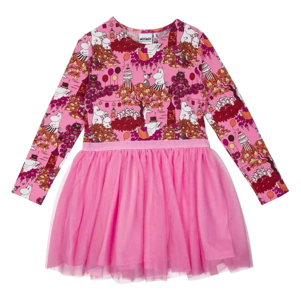 Mumin Juhlahetki Tyllklänning i rosa är en underbar klänning med långa ärmar, där det finns en sammetsrem och en mjukt fallande tyllkjol. Ovanpå finns det ett härligt Juhlahetki-mönster där invånarna i Mumindalen firar tillsammans i en trädgård.