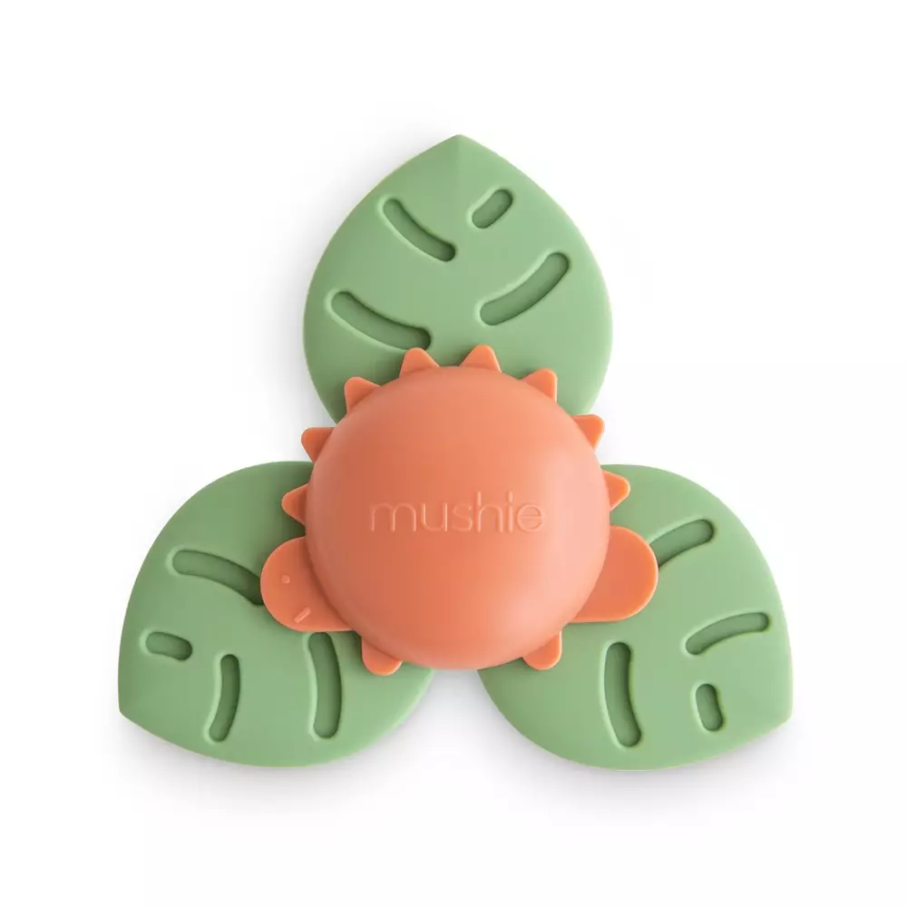 Mushie snurrande sugkoppsleksak är en rolig dinosaurieformad aktivitetsleksak för barn. Leksaken har en kraftfull sugkopp som gör att den stannar på plats under lekstunden. Tack vare sugkoppen är den också lätt att ta med på resan, eller under bad- och måltidstillfällen. Leksaken är tillverkad av 100% livsmedelsgodkänd silikon, och i mitten finns en söt dinosaurie.