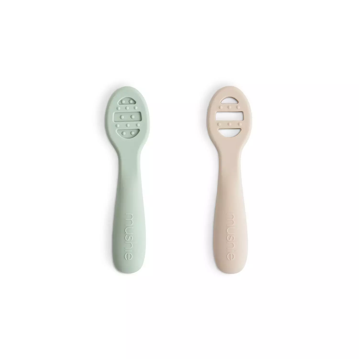Mushie första skedar i silikon 2-pack Cambridge Blue/Shifting Sand är enfärgade bestick för barnet. Mushie första skeden är lätt att hålla i handen och är designad för att vara i en lämplig storlek för barnet.