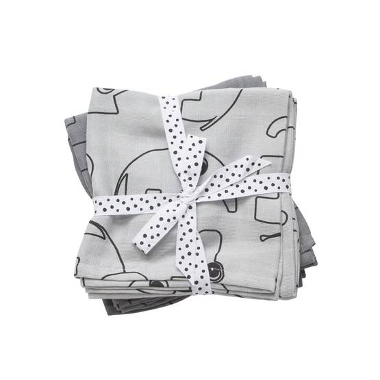 Muslinfilten är i mjuk bomull, och paketet innehåller två linne i grå nyanser.