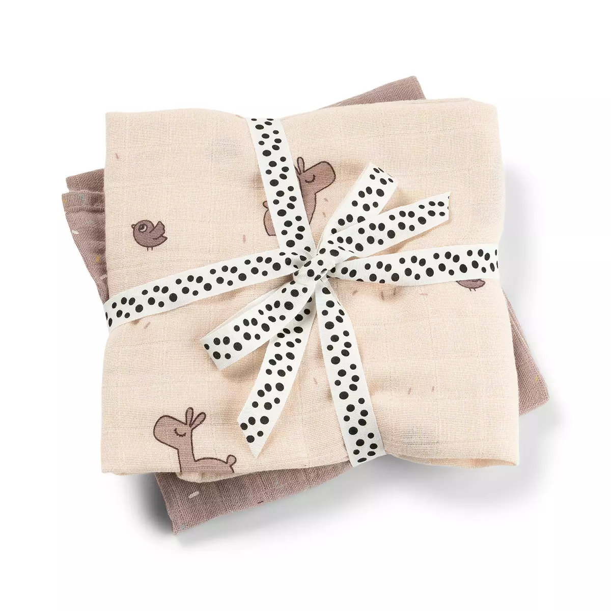 Muslinfiltarna Done By Deer Lalee Powder är mjuka och mångsidiga, perfekta för babyvård i olika situationer. De har ljusa och glada mönster av Done By Deers karaktärer i en subtil färgskala. Paketet innehåller två muslinfiltar.