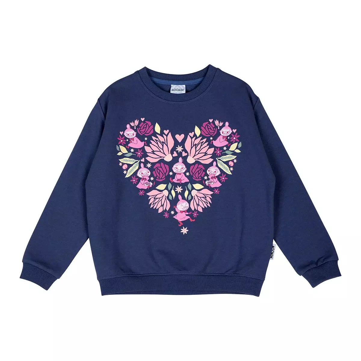 Mumin Dekorativ Sweatshirt i blått är en långärmad och bekväm tröja för barn. På tröjans framsida finns en hjärtformad bild av den underbara dekorativa och fylliga Dekorativ-designen.