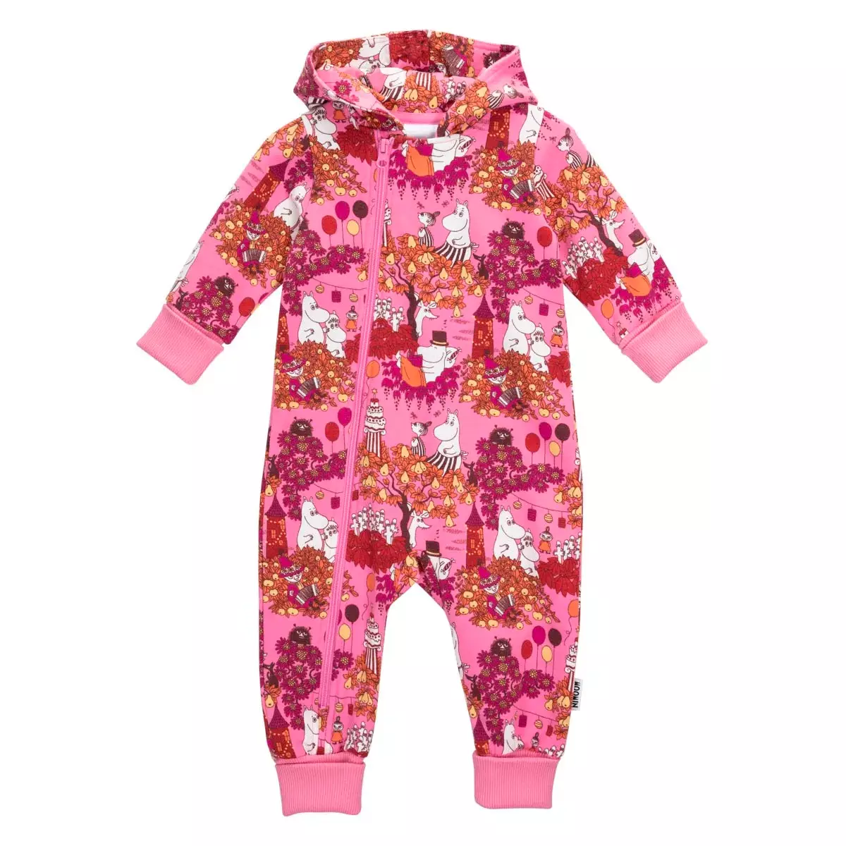 Martinex Muumi Festoverall i rosa är tillverkad av mjuk ekologisk bomull. I den rosa overallen firar invånarna i Mumindalen trädgårdsfester.