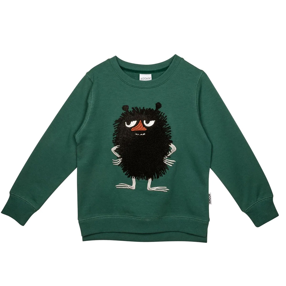 Muumi Haisuli Collegetröja Mörkgrön är en långärmad, bekväm tröja med ett stort Haisuli-motiv.