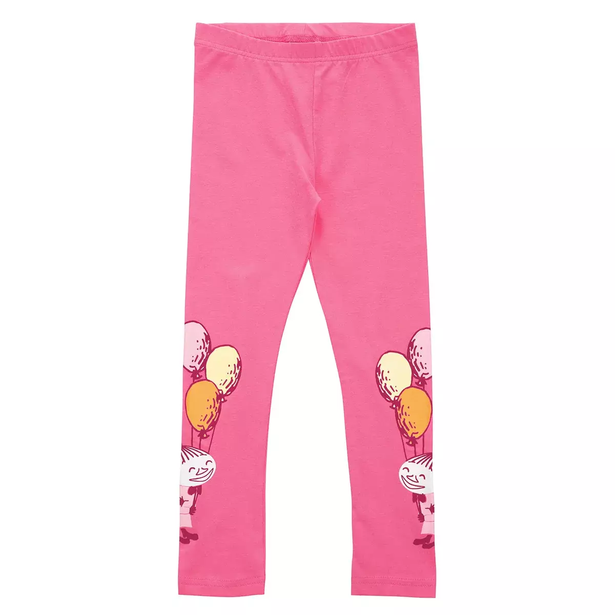 Muumi Juhlia Leggings rosa, är gjorda av härlig mjuk och elastisk ekologisk bomullsjersey. Lila leggings med glada bilder av Lilla My med ballonger.- Långa ben