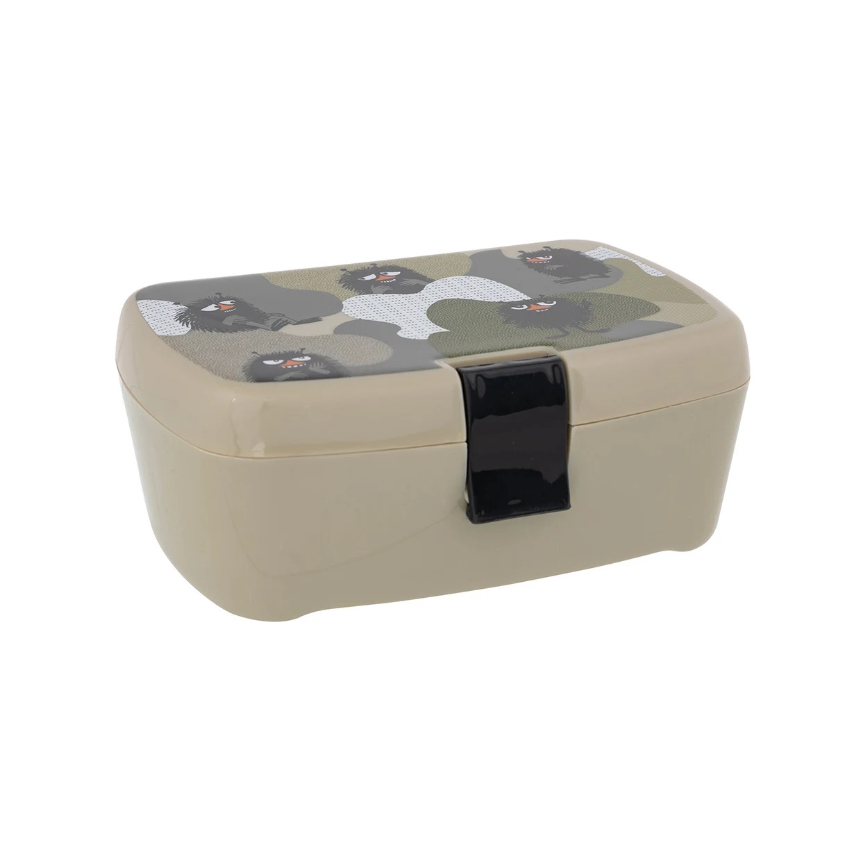 Mumin matlåda Gömma Oliv är en tvådelad matlåda för barn eller Muminens vän. På matlådans lock finns en rolig gömmande Haisuli.