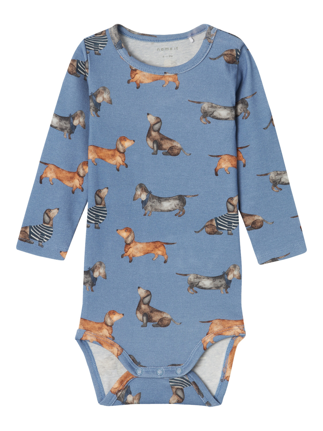 Name It barn Body Coronet Blue är en mjuk bomullsbody för baby med söta hundbilder. Bodyn har gott om plats för blöjan och knappar på axel- och grenpartiet för fastsättning.