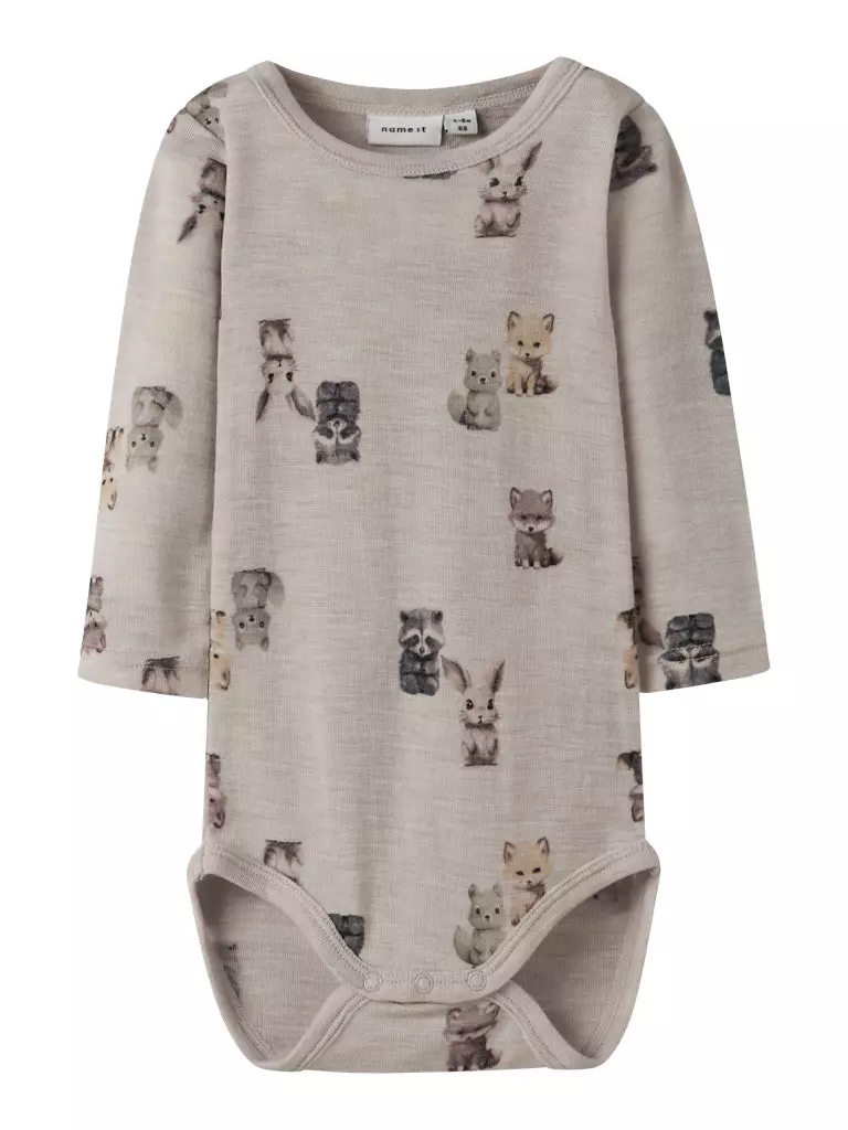 Name It baby body Merinoull Forest Animal - Nacreous Cloud är en mjuk merinoull body för baby med söta djurmönster. Bodyn har gott om utrymme för blöjan och har tryckknappar i grenpartiet för enkel påtagning. En underbar värmande body för höst och vinter!