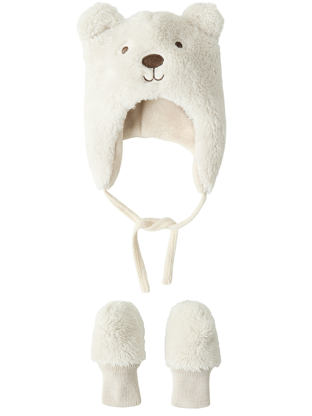 Name It fluffigt ljus accessoarset för baby för hösten! Mössan har björns ansikte och söta öron samt snörning som knyts under hakan.