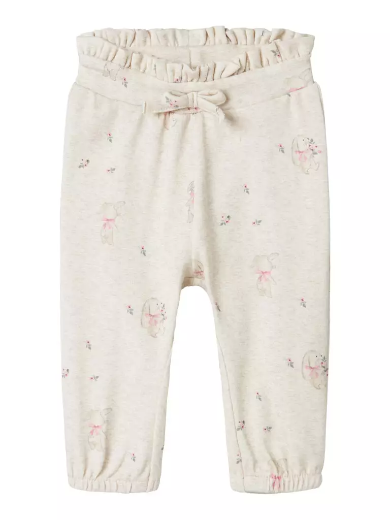 Name It babybyxor Peyote Melange är ljusa mjuka byxor för ditt barn, med små blommor och bilder av kaniner. Byxorna har ett justerbart elastiskt midjeband.