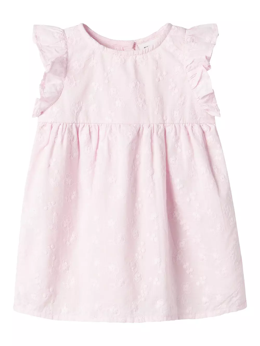 Mjuk rosa bomullsklänning för spädbarn. Söta volanger på axlarna, knäppning med knappar bak.