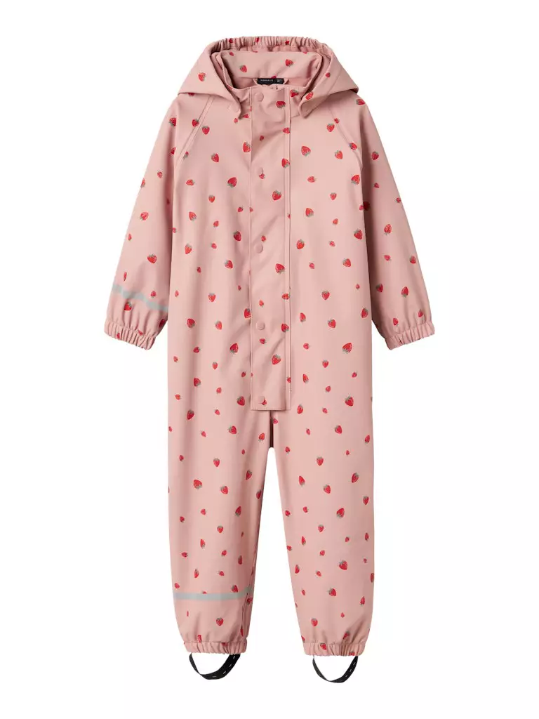 Name It barnens regnoverall med fleecefoder. Rosa overall med jordgubbsdesign.