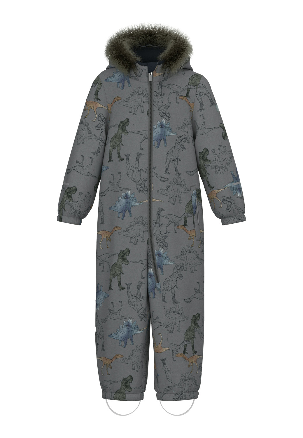 Name It vinteroveralls Mockingbird Dino håller ditt barn varmt under vinterleken. Den mörkgrå overallen har ett vackert dinosaurustyg och en härlig fuskpäls på huvan.