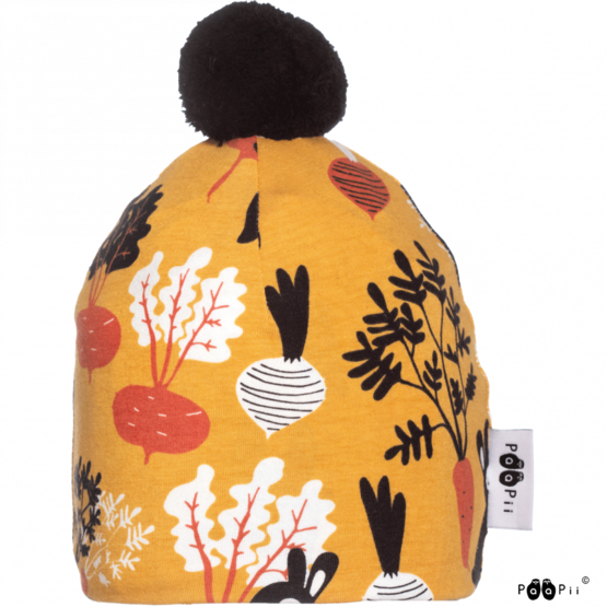 PaaPii:s trikåmössa med pom-pom i Satotanssi-mönster. Mössan är i en charmerande okra och rost färg.