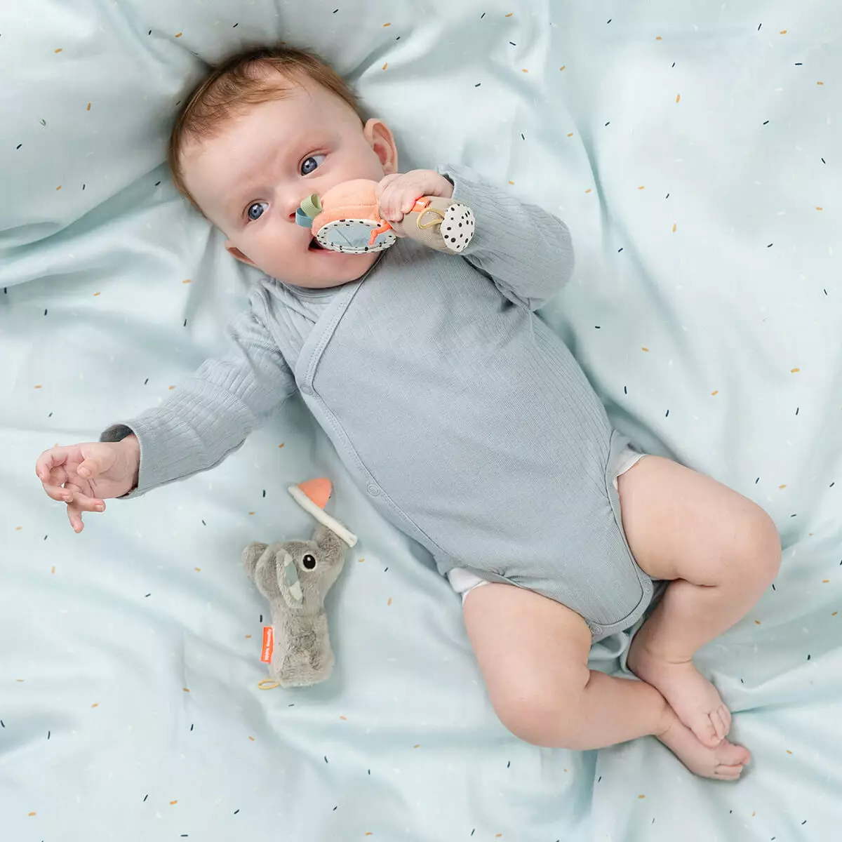 Skallra Done By Deer Sensory Rattle Mirror set, Tiny Farm Sand är ett bedårande set med två skallror för baby. Den ena skallran har en ballong med en liten spegel på andra sidan. Den andra skallran är en mjuk elefant som ger ifrån sig ett intressant prasselljud.
