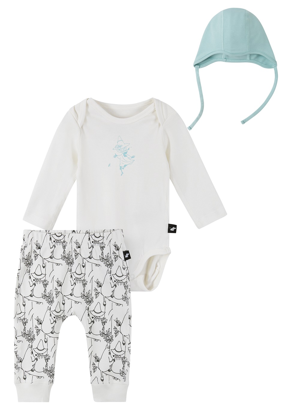 Reima Muumi-setet innehåller en body, byxor och mössa. Förpackad i en vacker presentask. Perfekt som gåva till baby shower!