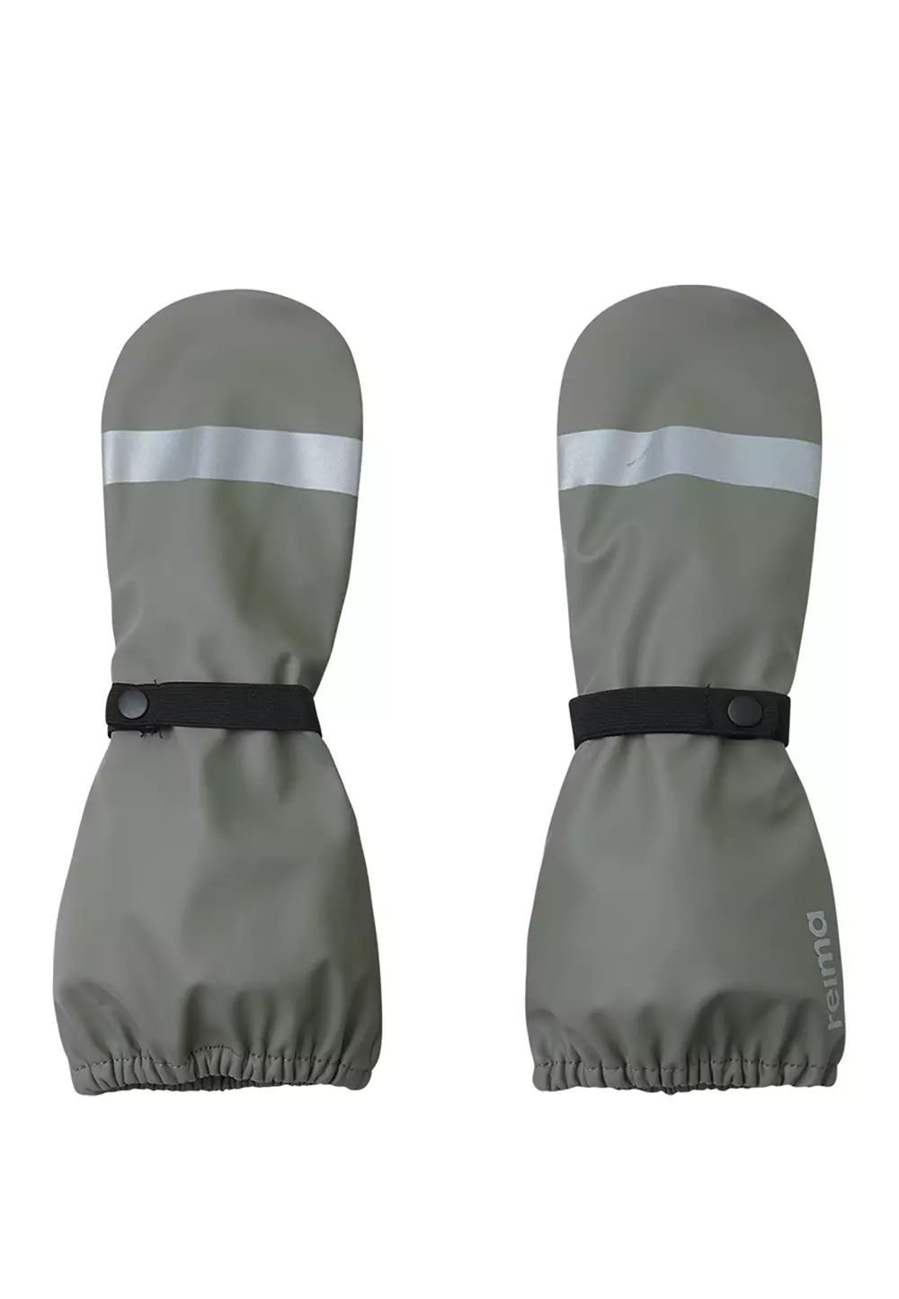 Reima Kura regnhandskar Grågrön håller barnets händer torra vid lek i regn, slask och i pölar. Handskarna är tillverkade av ett elastiskt och hållbart material med svetsade sömmar, vilket gör att de tål vatten utmärkt. De ofodrade handskarna är av ett smidigt material, vilket gör att de är praktiska för att baka samt klättra i träd.