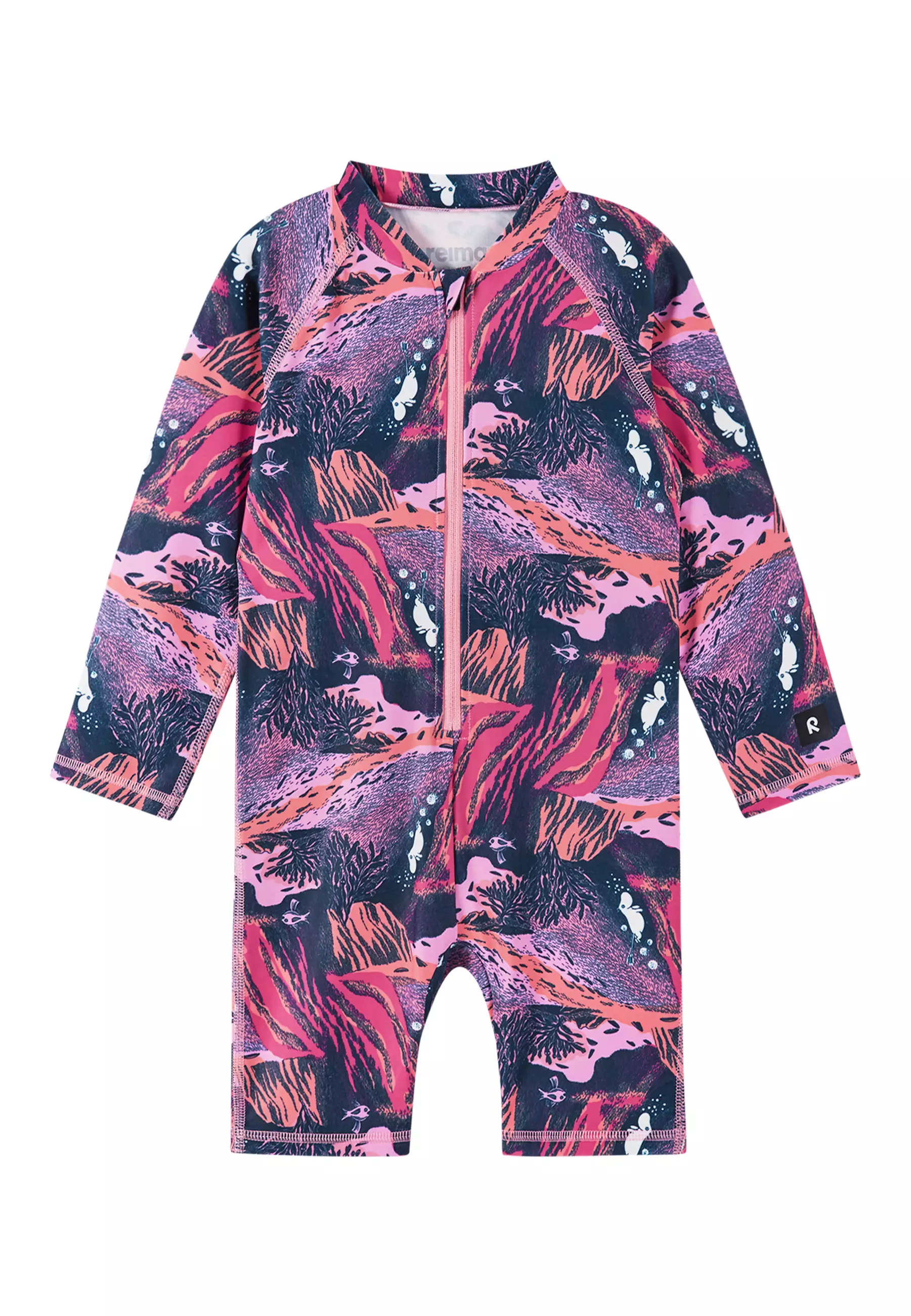 Reima Moomin Sandig UV-badbuksa i rosaröd skyddar effektivt mot solens skadliga UV-strålar. Den mönstrade Muumi-badbuksa har långa ärmar och halvlånga ben, och är lätt att ta på tack vare den långa dragkedjan. Badbyxan är tillverkad av ett snabbtorkande material som känns behagligt mot huden. De platta, icke-skavande sömmarna ger extra komfort. Skyddsfaktorn i badbyxan är 50+.
