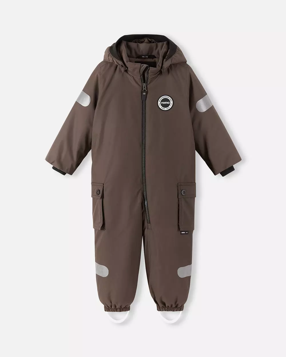 Reima Marte vinteroverall Dark choco är en lätt vadderad overall för småbarn i milda vinterväder. Den retroinspirerade klassikern från Reima har lätt vaddering, rymliga fickor och mjuka resårer. Overallen håller barnet varmt även under längre snölekar, eftersom alla sömmar är tejpade för att vara vattentäta, vilket gör att overallen står emot både vatten och vind.