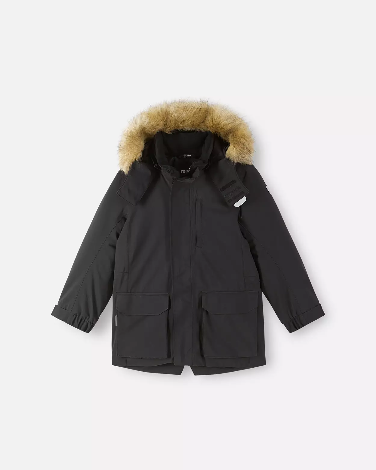 Reimatec Ajaton vinterjacka Black är en klassisk, hållbar och vattentät vinterjacka för barn. Parkamodellens jacka är gjord av mjukt och elastiskt material som har alla viktiga detaljer och mycket återvunnet fiber. Stora fickor med lock och en härlig, fluffig fuskpäls vid huven.