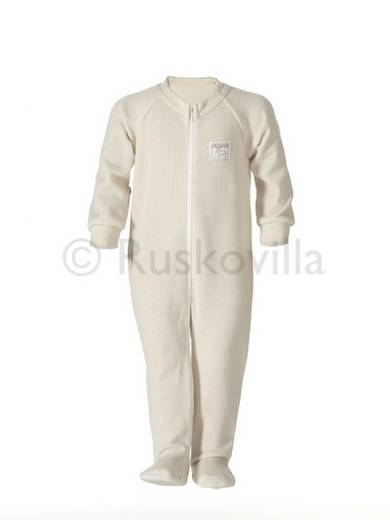 Overallens färg är naturvit. Benen har fötter, så overallen värmer även tårna. Den långa dragkedjan gör det lättare att klä barnet i overallen.