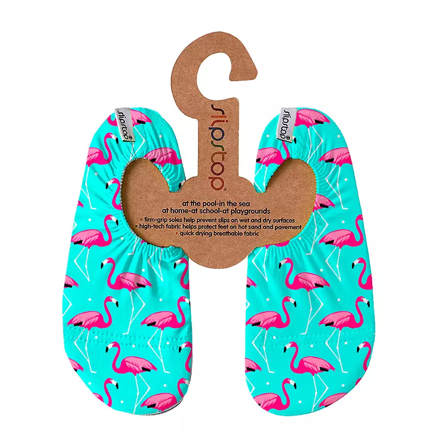 Slipstop skor Blush är mångsidiga skor med en rolig flamingo-mönster. Skorna kan användas på förskolan, i skolan, på stranden, i båten eller hemma. De är fjäderlätta och känns som att gå barfota.