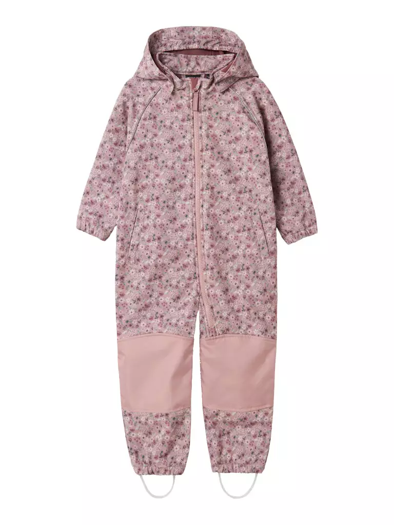 Softshell dräkten Name It Alfa Woodrose Blossom är det perfekta valet för övergångssäsongen, med en ljusrosa botten och ett rikt blommönster. Alfa-dräkten är ett mycket populärt val för förskoleåldern.