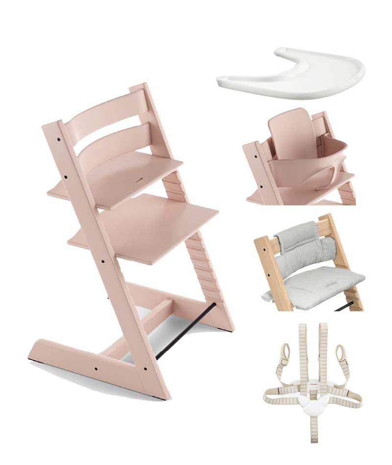 Tripp Trapp startpaket Stokke 5 i 1 Serene Pink innehåller Stokken Tripp Trapp stol, Baby Set och bricka samt säkerhetsbälten och sitsdyna.