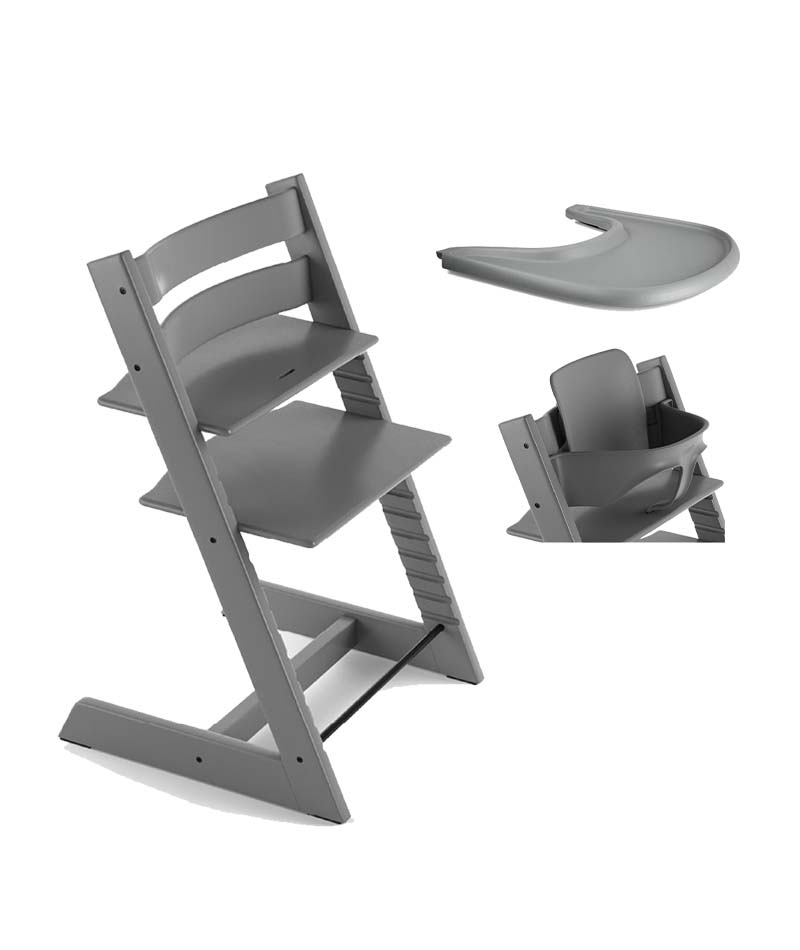 Tripp Trapp startpaket Stokke Storm Grey innehåller Stokkes Tripp Trapp matstol, Baby Set och bricka, alla i färgen Storm Grey.