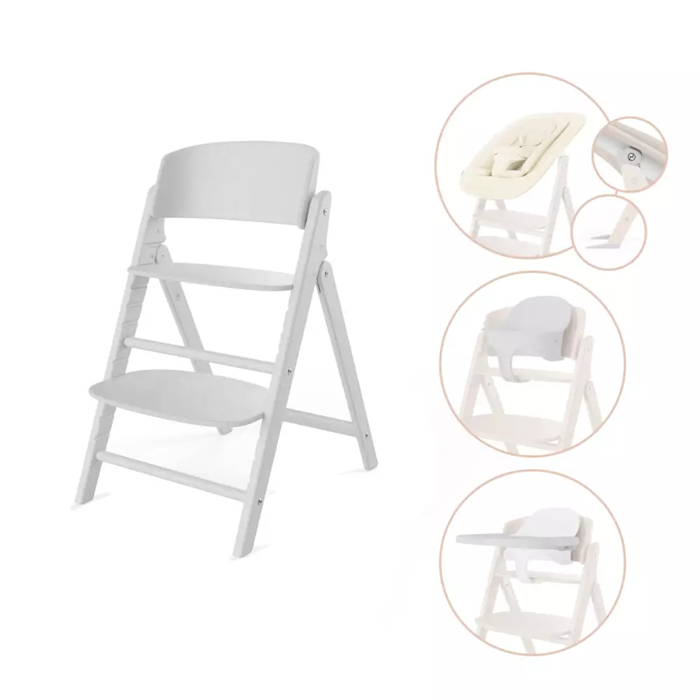 Cybex CLICK & FOLD matstol 4in1 All White innehåller matstolen, en bouncer, Baby Set och en bricka i färgen All White. Passar att använda från ca 6 månader och framåt.