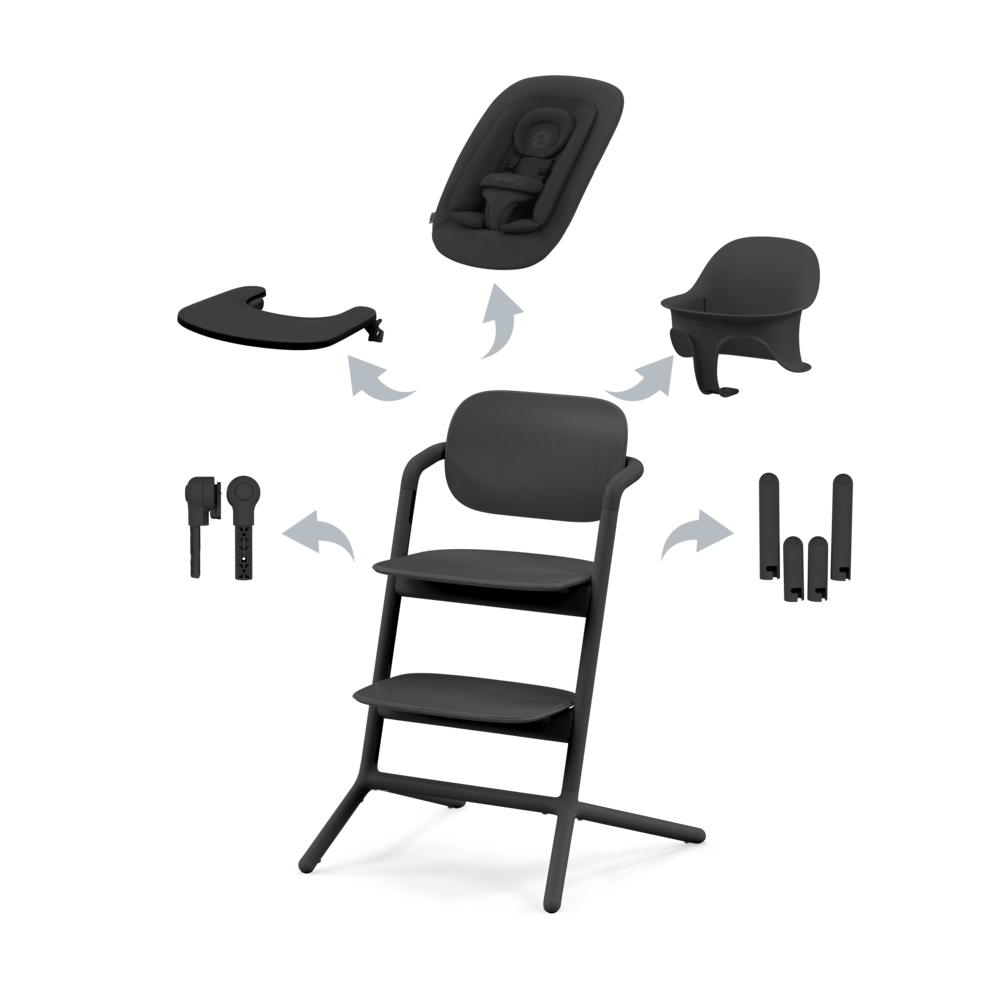 Startkit Cybex Lemo 4 i 1 Stunning Black innehåller matstol, gungstol, babyset och bricka. Färgen är stilren svart. Passar för användning från nyfödd. Cybex Lemo är en vacker och hållbar matstolpaket som växer med barnet.