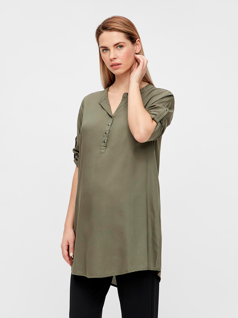 Mamalicious Mercy Dusty Olive gravidtunika är en avslappnad och enkel klädsel för blivande mammor. Tunikans 3/4-ärmar har avtagbart tygbälte som vackert framhäver den växande magen. De vändbara ärmarna har knappfäste, så att ärmarna hålls på plats. Knappen vid halsen möjliggör även amning.