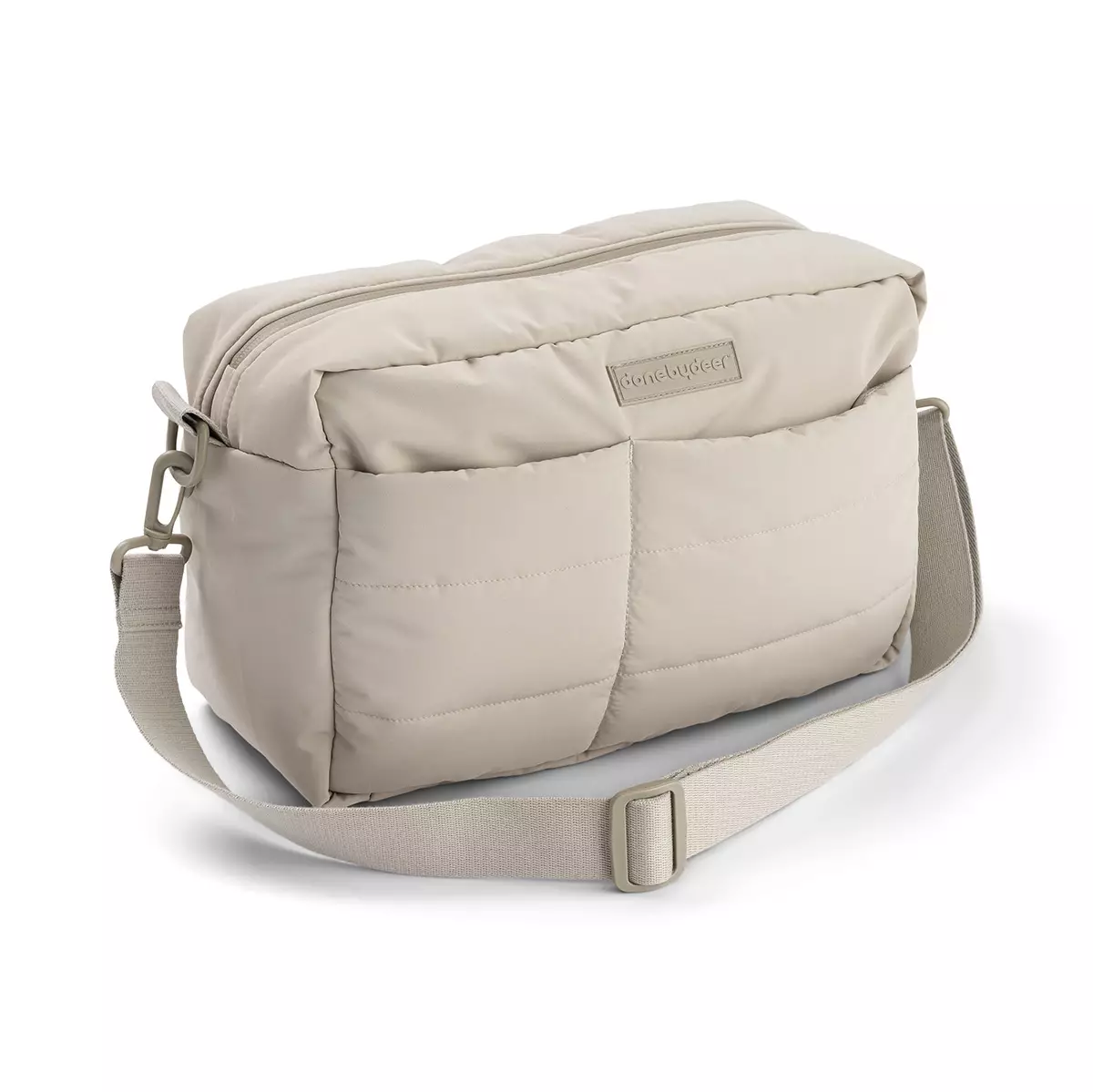 Babytaske Done By Deer Quilted Stroller bag Sand är en rymlig och praktisk babytaske, som har flera fickor både på insidan och utsidan, så att varje sak har sin egen plats och innehållet alltid hålls organiserat. Väskan har även en praktisk termoficka för flaska, som håller drycken varm eller kall under lång tid. Yttermaterialet på babytaske är vattenavvisande, så lite regn skadar inte. Handtaget på babytaske är justerbart, och dragkedjan är dubbelriktad, vilket gör den lätt att använda. Väskan kommer med en skötbädd och fästanordningar för barnvagnens handtag.