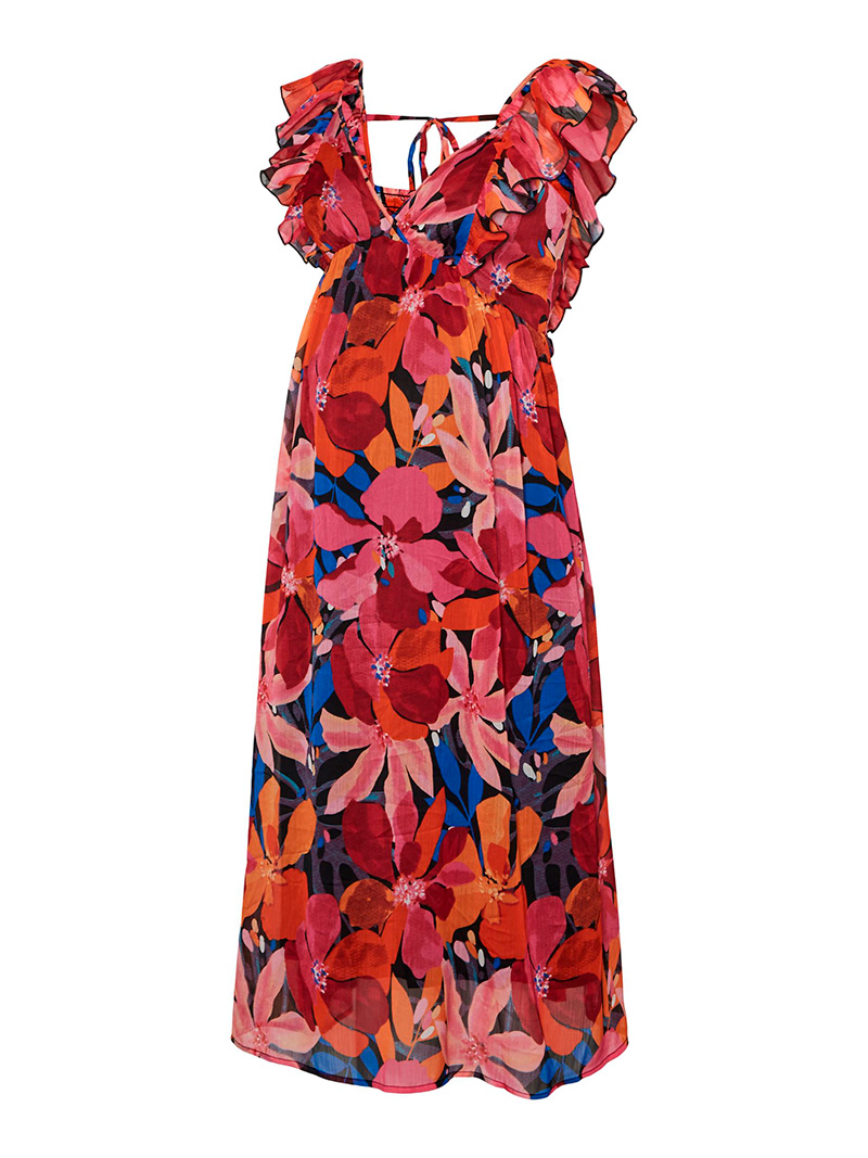 Vacker Mamalicious festklänning passar för graviditet och amning. Volanger vid halsringningen och iögonfallande blommönster!