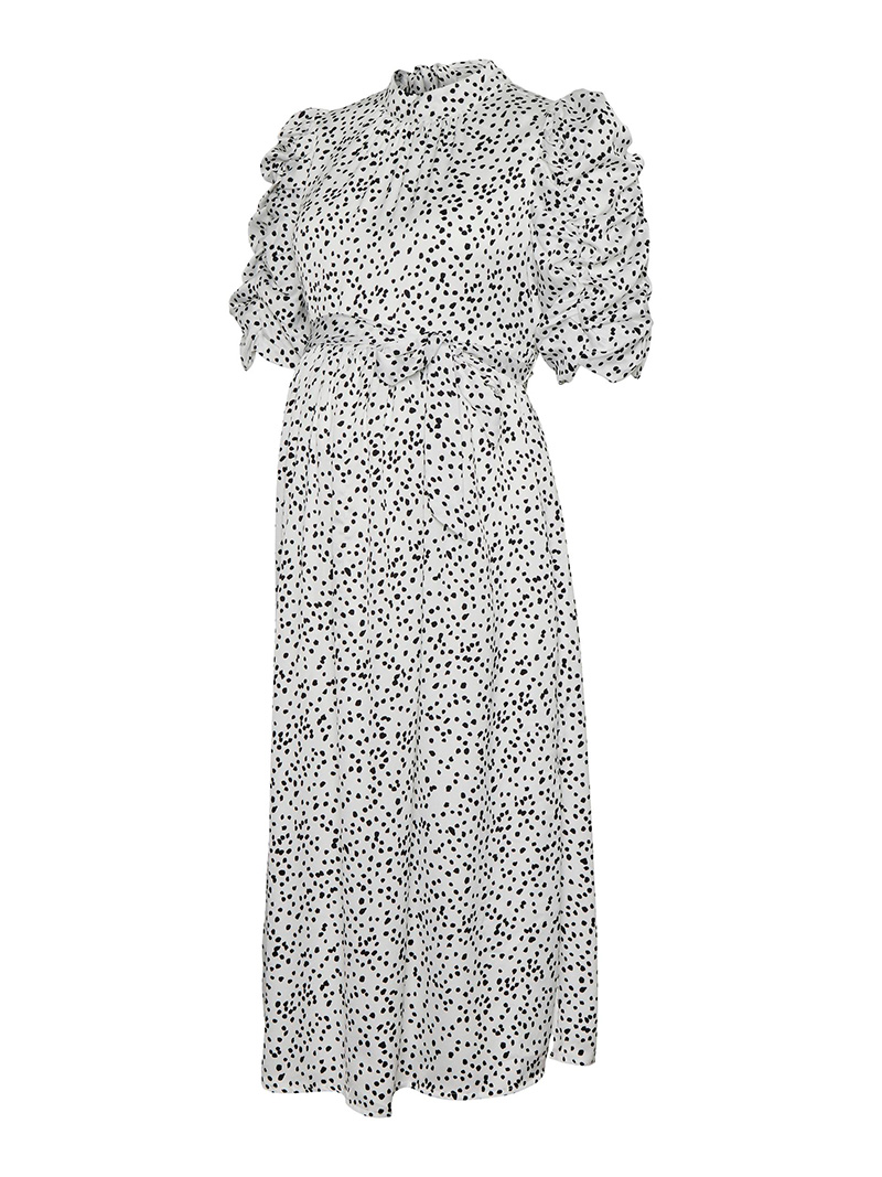 Vacker Mamalicious gravidklänning för vår- och sommarfester. Vit klänning med svarta prickar.