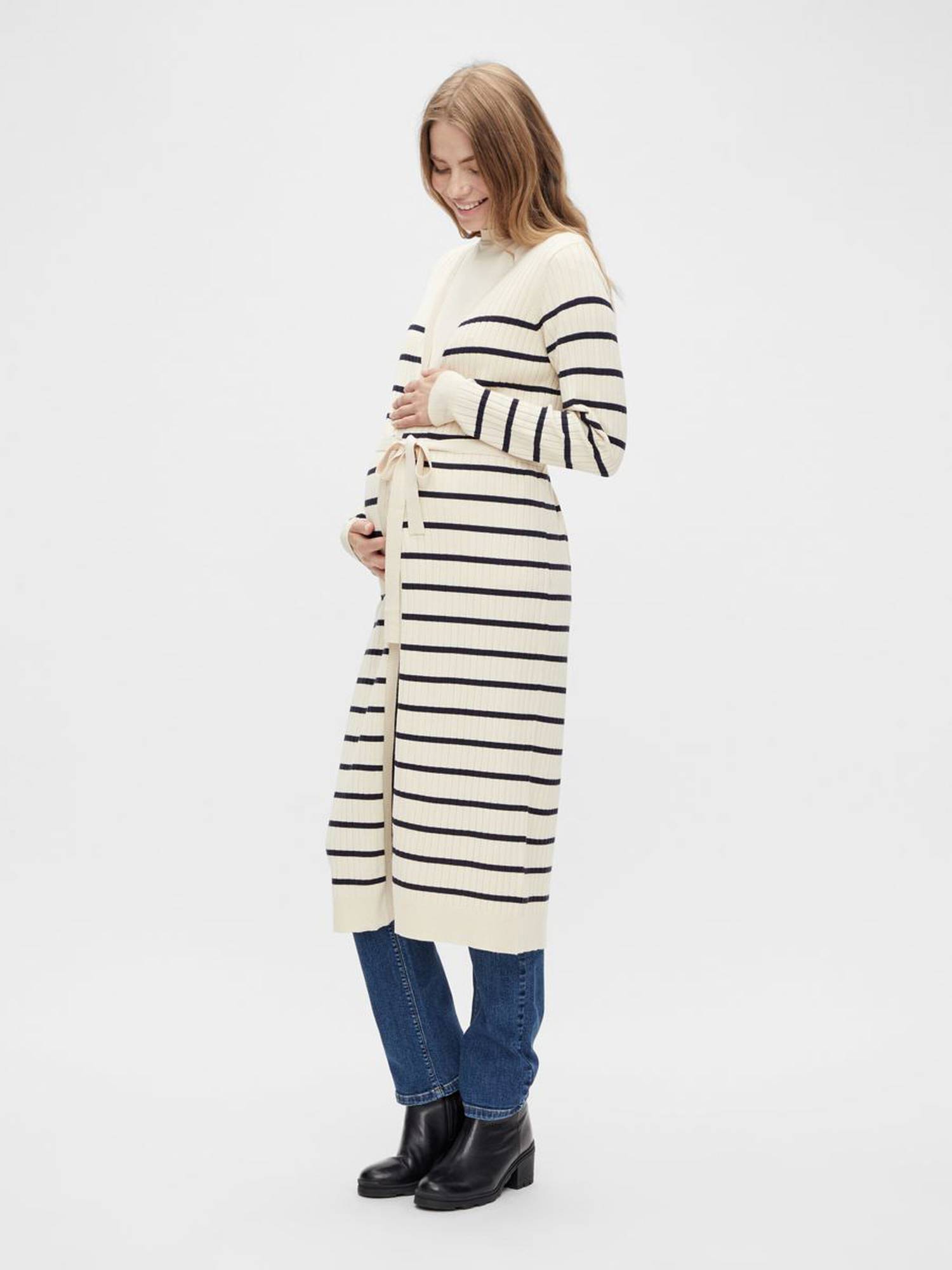 Knälång ribbad kofta med ett band att knyta runt midjan. Kappan har inga knappar, vilket gör att tröjan passar bekvämt genom hela graviditeten.