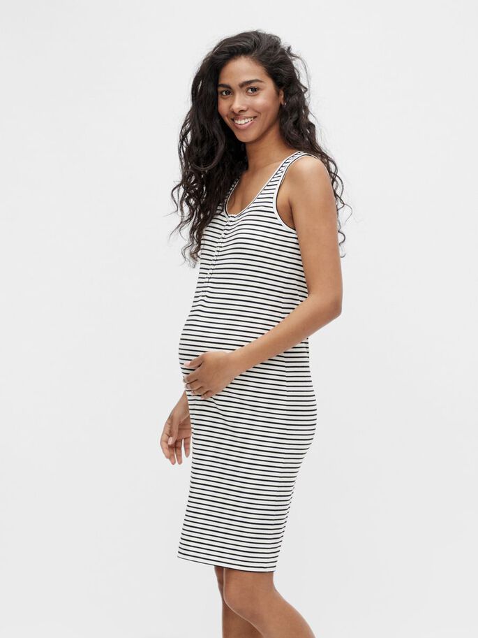 Randig ärmlös gravidklänning som också fungerar som amningsklänning. Klänningen har tryckknappar framtill. Midi-längd gravidklänning.