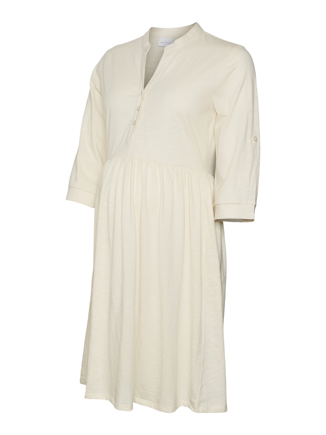 Ljus Mamalicious miniklänning för gravida. Klänningen har 3/4-ärmar och rynkad nederdel. Gravidklänningen passar också för amning.