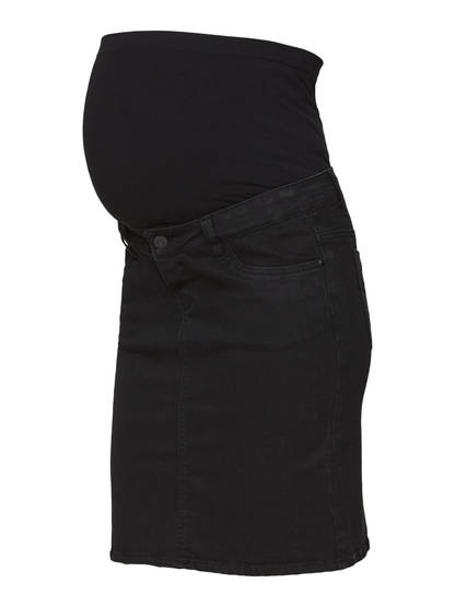 Mamalicious Lola Slim gravidkjol är en svart denimkjol för blivande mammor. Kjolen har en hög midja med resår som inte klämmer eller trycker mot den växande magen.