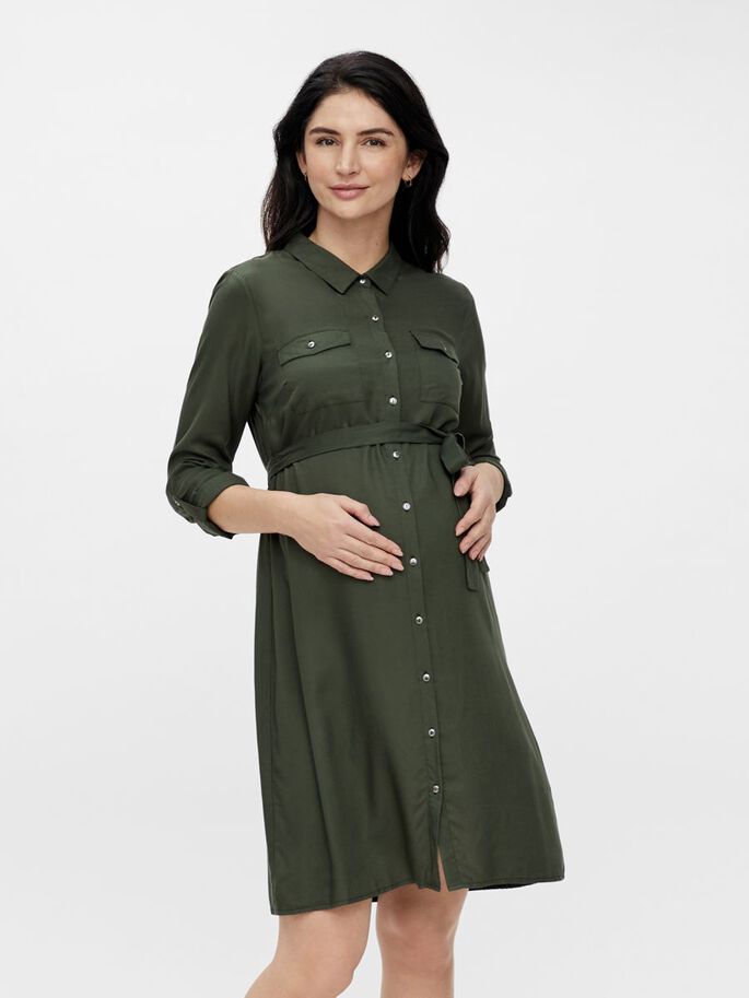 Mamalicious mamma klänning Mercy är en bekväm och avslappnad tunika för blivande mammor. Den långärmade tunikan har ett avtagbart tygbälte som framhäver den vackert växande magen. Knäppningar fram och på ärmarna gör att uppkavlade ärmar håller sig på plats. Snäppknäppningarna fram möjliggör även användning vid amning.