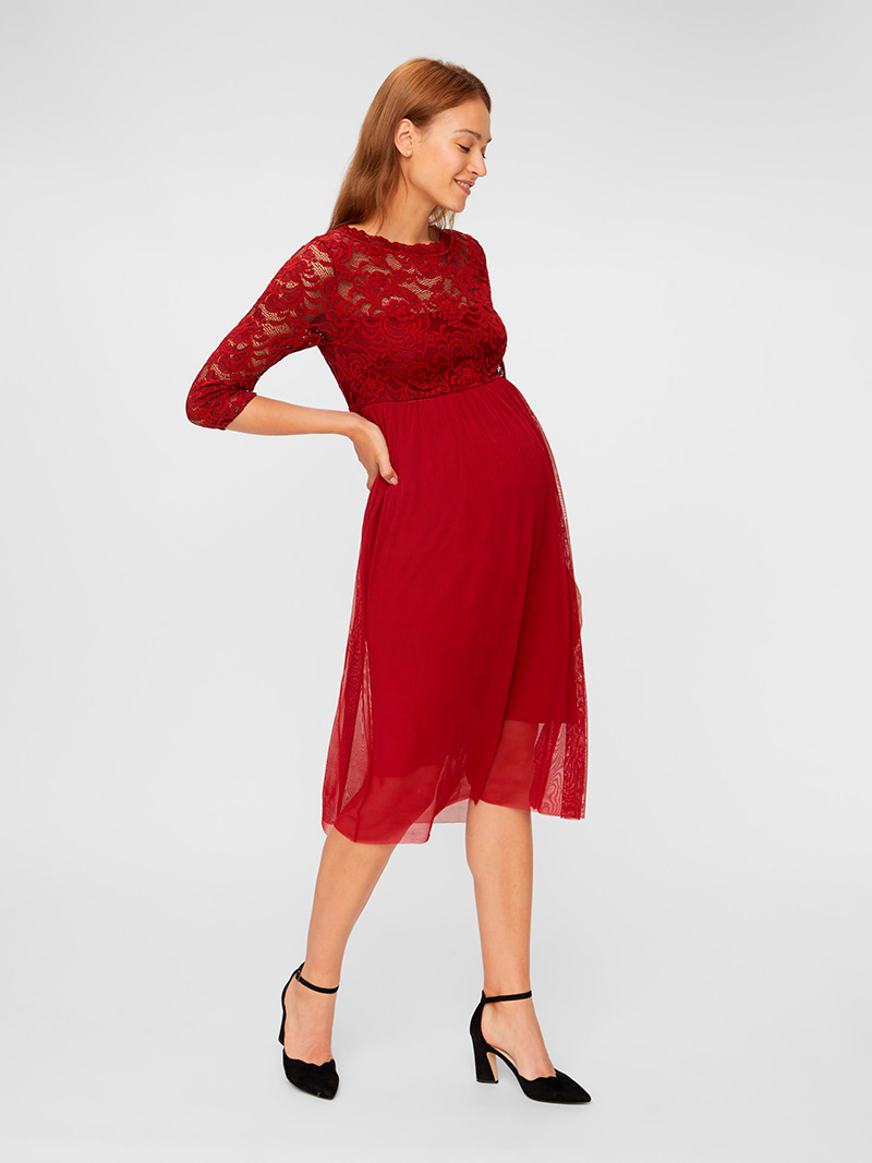 En vacker mörkröd festklänning för blivande mödrar. Klänningen har spetsärmar och sidentyg i midjan.