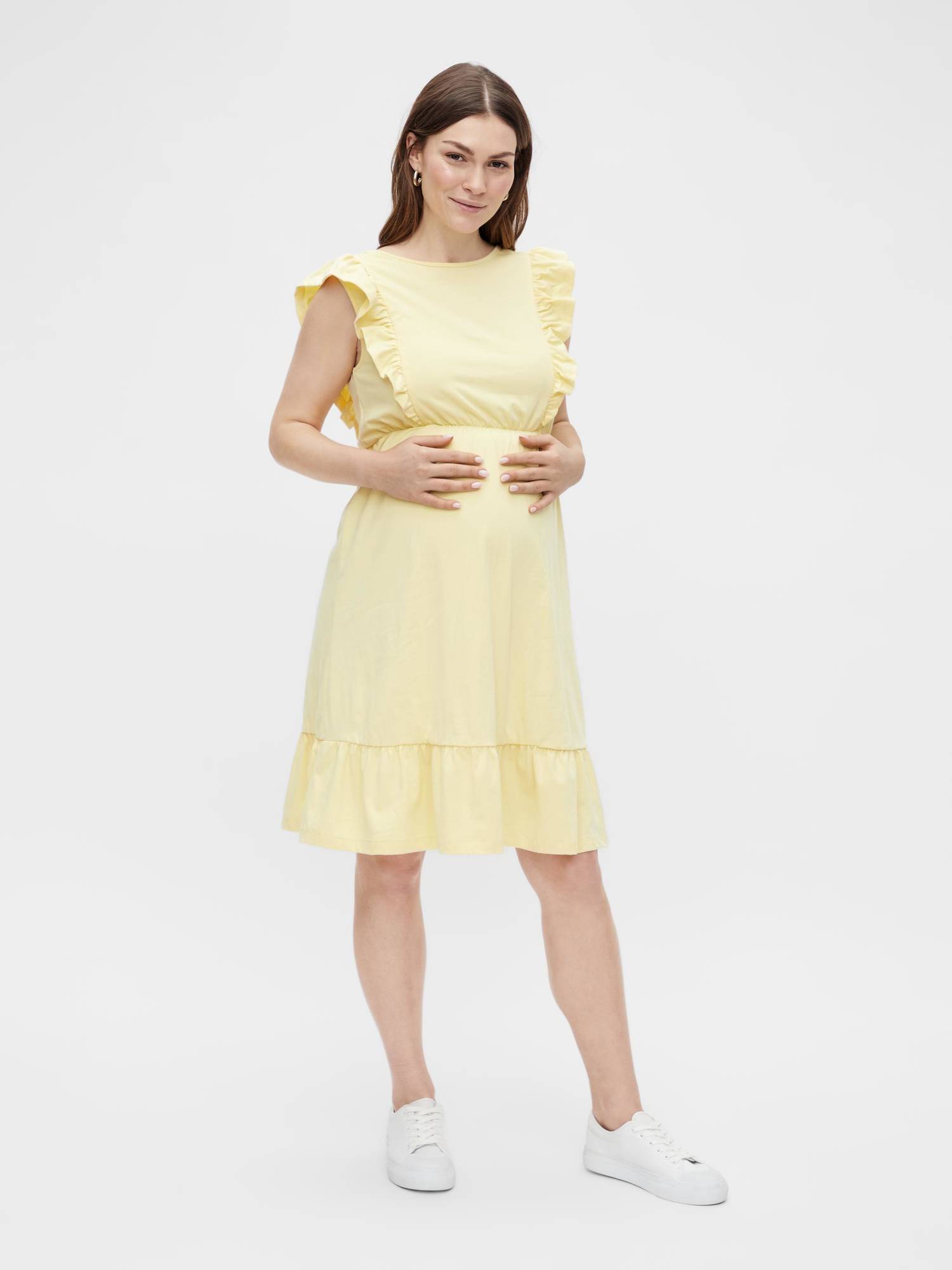 Vaniljfärgad gravidklänning med söta volanger på axlarna och volangkjol. Klänningen passar både gravida och ammande.