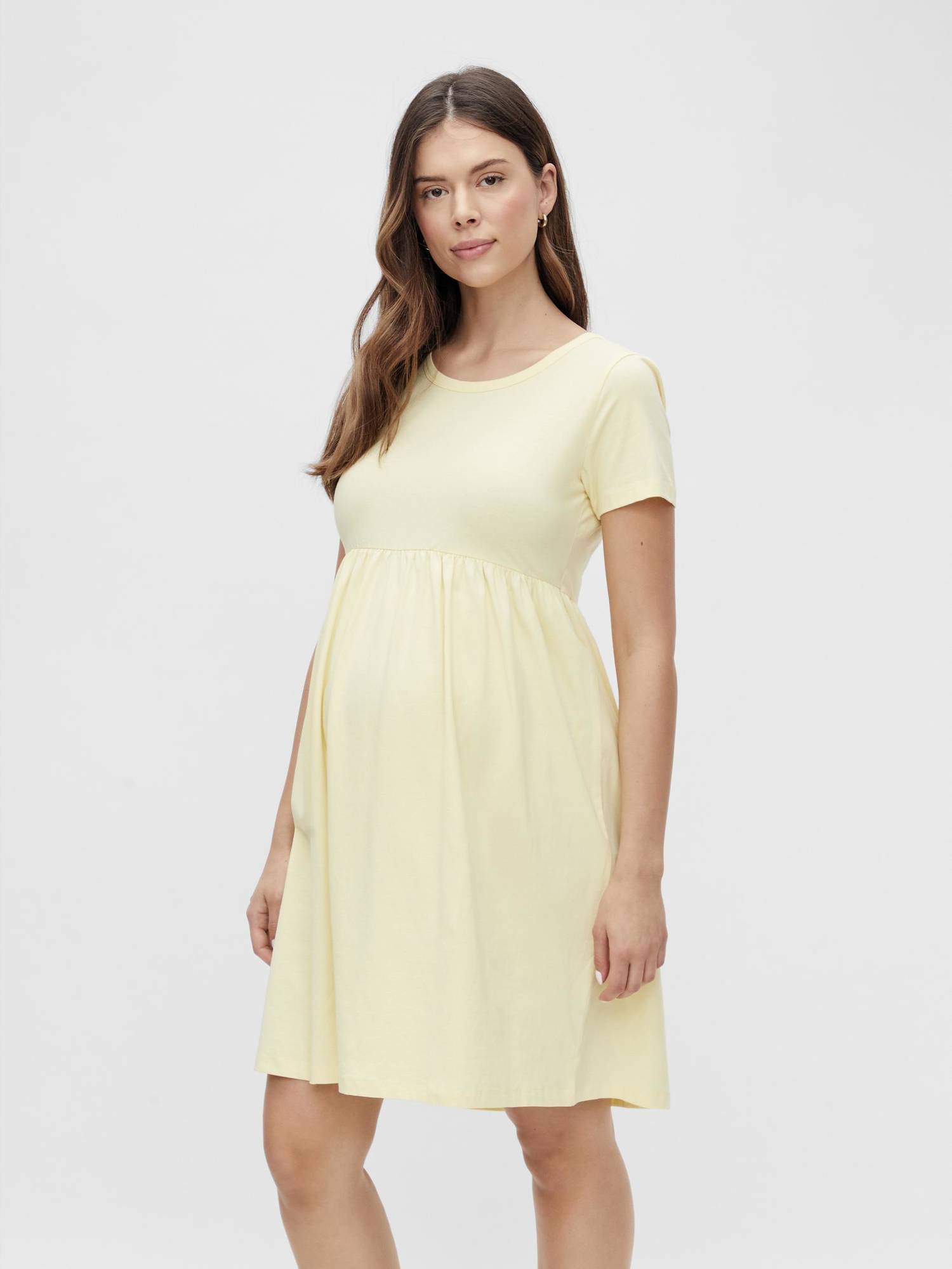 Bekväm kortärmad gravidklänning för förväntande mammor. Klänningen i vaniljfärg har en midilängd på fållen.